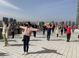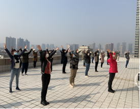 随着激昂的音乐,上午10时,工作人员放下手头的工作,走出办公室,和同事们一起来到九层平台,认真地做起健身操。